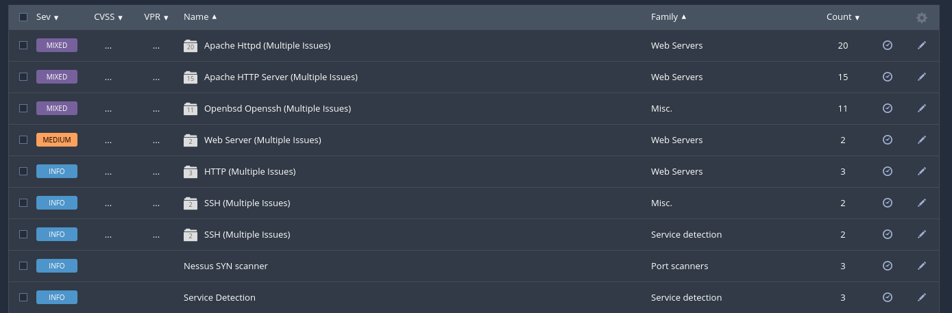 Running an external (none non-authenticated scan) against the system found a large number of vulnerabilities broken into a small number of categories, The more systems and open ports the more categories you may be likely to see here.